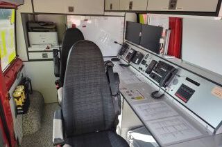 Die Fahrer- und Beifahrersitze lassen sich um 180° drehen und können bei Bedarf als zwei zusätzliche Arbeitsplätze genutzt werden. An der Fahrzeugseite ist eine Markise montiert, die ausgefahren und zu einem Vorzelt erweitert werden kann. Mit der mitgeführten Tischgarnitur lässt sich dort ein Besprechungsbereich für Lagebesprechungen einrichten.